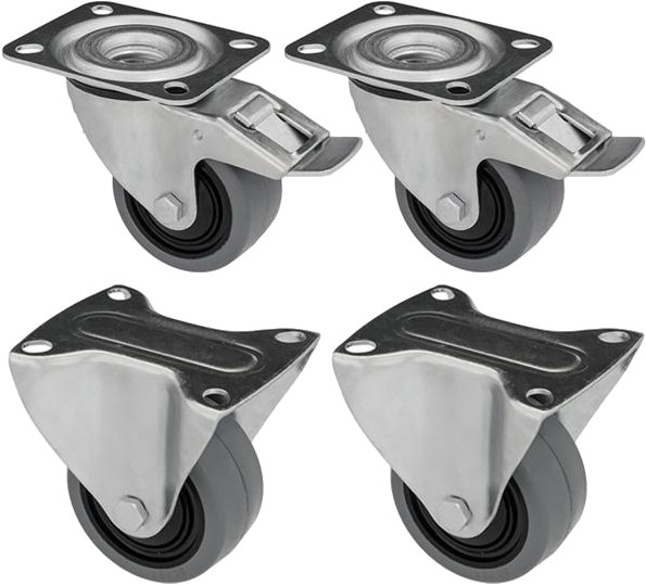 Zestaw 4 kół transportowych fi 125 mm przeznaczonych do różnego rodzaju wózków i platform. Pojedyncze koło wykonane zostało z tłoczonej stalowej blachy i niebrudzącej szarej gumy. Poliamidowa piasta wzmocniona została dodatkowymi osłonkami z tworzywa. Koła skrętne z pełnej gumy mocowane są na głowicy skrętnej i stałej.