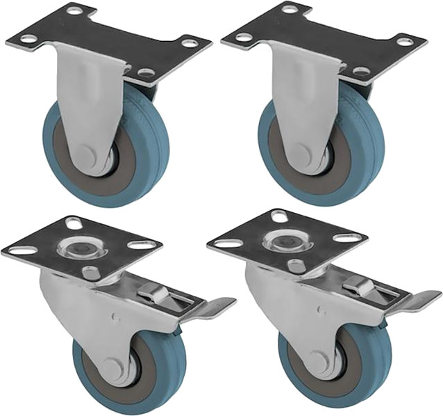KOMPLET kółek transportowych z oponą gumową. Pojedynczy zestaw kołowy wykonany został z ocynkowanej blachy stalowej z kołem gumowym. Kółka obrotowe gumowe posiadają łożysko kulkowe. Komplet zawiera: