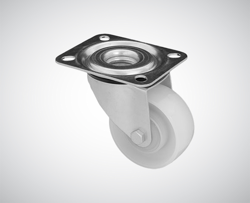 Zestaw kołowy skrętny, wykonany z ocynkowanej blachy stalowej. Koło poliamidowe. Mocowanie na płycie w głowicy skrętnej na łożysku kulkowym.