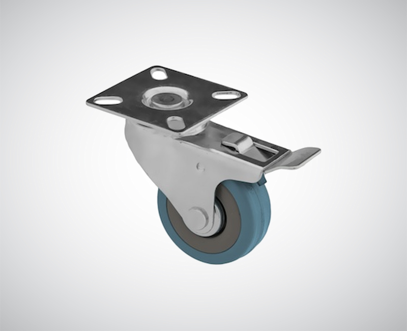 Zestaw kołowy z hamulcem wykonany z ocynkowanej blachy stalowej, koło z oponą gumową. Mocowanie na płycie w głowicy skrętnej na łożysku kulkowym.