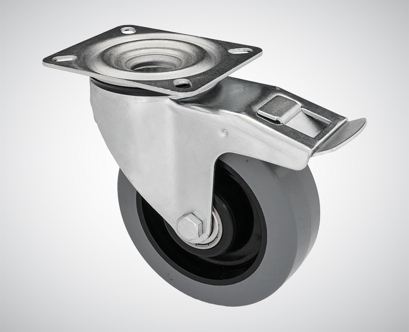 Zestaw kołowy z hamulcem wykonany z ocynkowanej blachy stalowej, koło pełne z elastycznej szarej gumy. Mocowanie na płycie w głowicy skrętnej na podwójnym łożysku kulkowym.