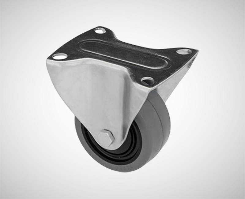 Zestaw kołowy stały wykonany z ocynkowanej blachy stalowej, koło pełne z elastycznej szarej gumy. Mocowanie na płycie w głowicy stałej na łożysku kulkowym.